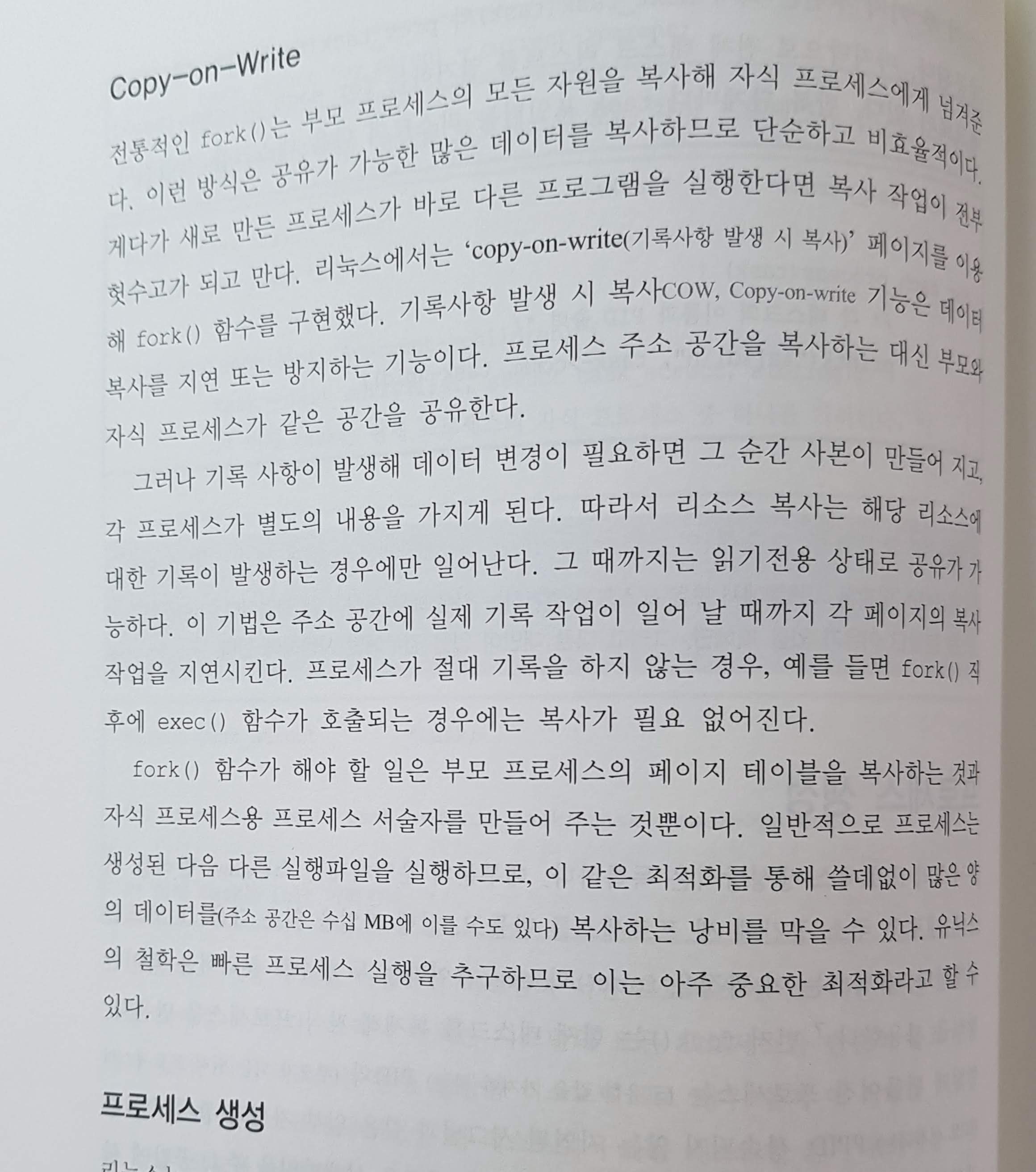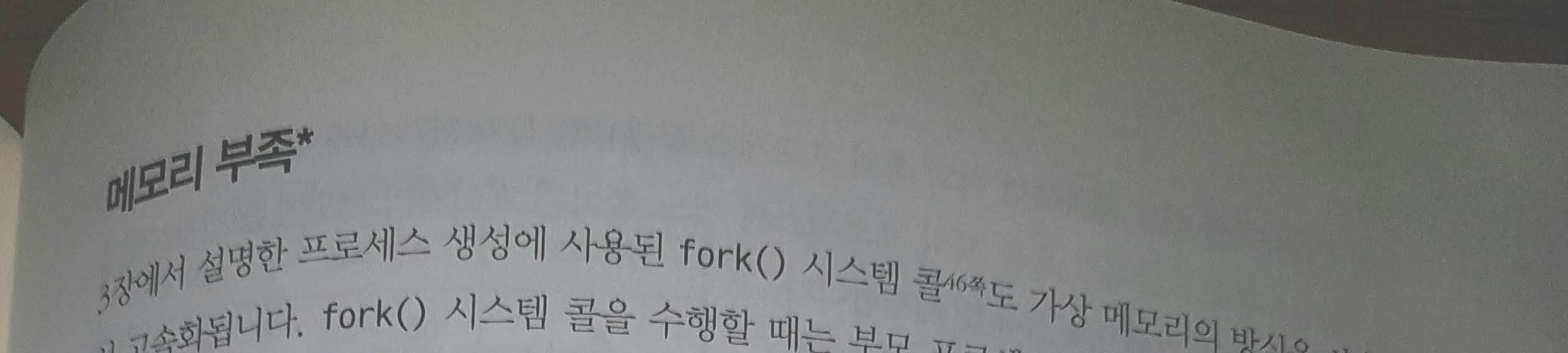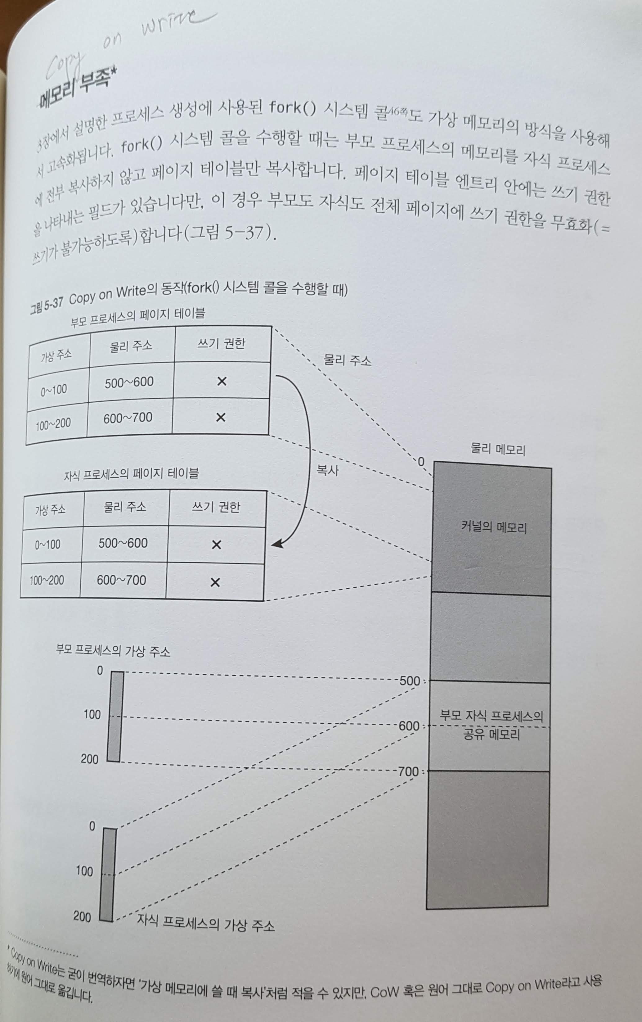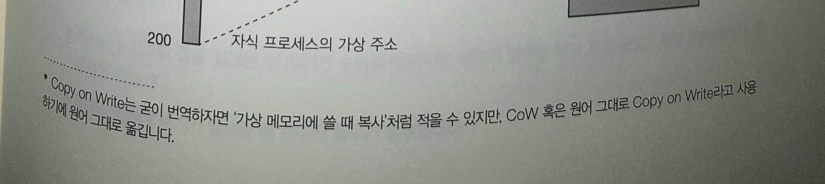 3장에서 copy on write를 설명하는 부분인데, 앞 장과 절에서 충분히 copy on write를 설명해 놓고 (심지어는 '미주'에서도 copy on write를 설명하고 있음) 제목은 "메모리 부족" 으로 뽑았다.